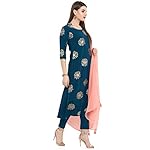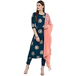 Janasya women’s foil print 3/4th sleeves a-line kurta and Turquoise blue partially elasticated crepe narrow pant with pink gerogette Dupatta.